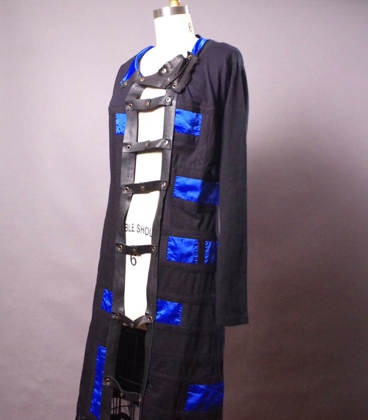 OOAK Long Cardigan Jacket, Unique Avantgarde Jacket, Black and Blue Leather Jacket, Chic, Edgy