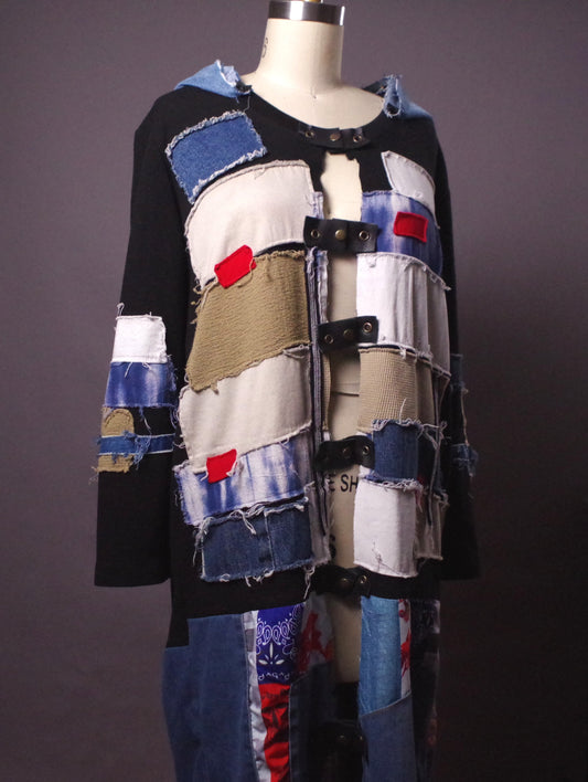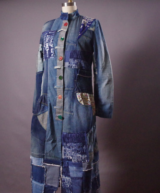 Upcycled Patchwork Denim Jacket, Long Jean Jacket, Unique Denim Patchwork Jacket