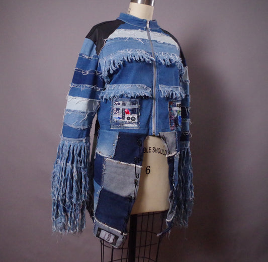 OOAK Patchwork Denim Jacket, Fringe Jean Denim Patchwork Jacket, Upcycled Unique Denim Jacket